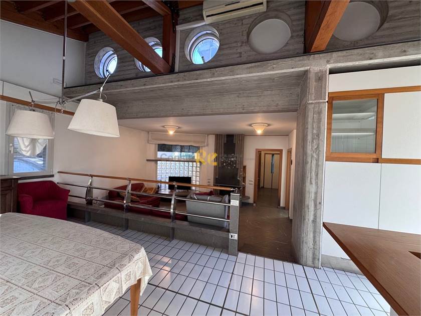la particolarità della zona giorno, un esempio di design e funzionalità che lascia di stucco il visitatore con le sue ampie vetrate ed il sapiente mix di stili che contrappone la pulizia del cemento armato con il calore delle travi in legno lamellare.