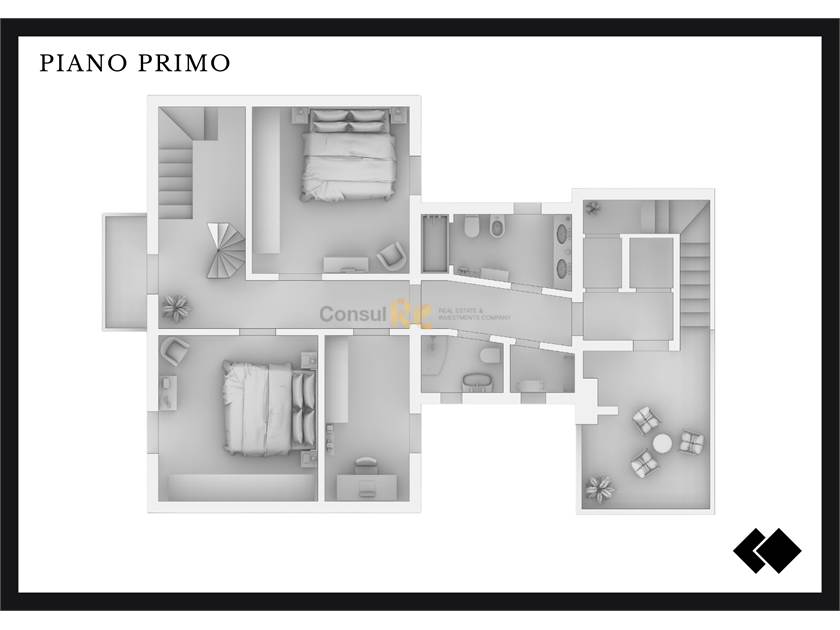 Piano primo, dove è individuata la zona notte ed in ultimo la zona mansardata, piccola e raccolta ma comunque interessante per poter insediare una zona relax, palestra o una zona studio, vista la corrispondenza con l’ampia terrazza esterna.