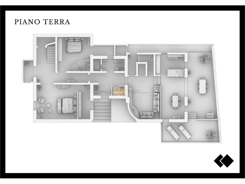 Piano terra, con una ampia zona giorno collegata alla corte esterna, servizi igienici, e camere per gli ospiti